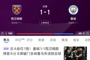 3月15日,曼城客场1-1战平西汉姆联,同轮阿森纳2-0击败埃弗顿。曼城在少赛一场的情况下落后阿森纳多达9分。
